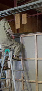 大きすぎるため、キャンバスのカットを近所の体育館を借りて行いました。
